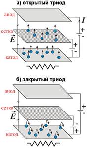 Когда на сетку подается положительный потенциал (меньший потенциала на аноде), электрическое поле разгоняет электроны в направлении сетки. Поверхность сетки делается не сплошной, а состоит из отдельных тонких проводов, образующих решетку. Из-за этого электроны почти не попадают на сетку, а пролетают сквозь нее на анод, создавая ток в анодной цепи (рис. 3а). Если же потенциал сетки отрицателен, электрическое поле препятствует движению электронов, возвращая их на катод, и ток в цепи не течет (рис. 3б).