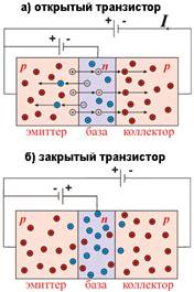 Пусть как на коллектор, так и на базу транзистора подан отрицательный потенциал относительно эмиттера — на базу меньший, на коллектор больший (рис. 4а). Тогда электрическое поле на контакте база—эмиттер направлено слева направо и способствует движению дырок из эмиттера в базу, а электронов — наоборот, из базы в эмиттер. Поле на контакте база—коллектор направлено также направо и препятствует переходу дырок из коллектора в базу и электронов из базы в коллектор. Однако дырки, попавшие в базу из эмиттера, под действием этого поля свободно проходят в коллектор. Обычно базу делают достаточно тонкой, поэтому в коллектор переходят практически все дырки из эмиттера, и в коллекторной цепи течет достаточно большой ток.