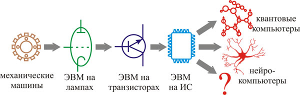 С физикой, несомненно, связано и будущее компьютерной техники. Наиболее перспективными направлениями ее развития на данный момент считаются создание квантовых компьютеров и нейрокомпьютеров (рис. 5). Квантовые компьютеры будут использовать в качестве базовых элементов отдельные молекулы, поэтому, очевидно, их развитие невозможно без применения аппарата квантовой физики. А нейрокомпьютеры — это устройства обработки информации, в работе которых будут использоваться принципы функционирования центральной нервной системы и мозга. Такое заимствование возможно только после детального изучения этих систем, в том числе с физической точки зрения.