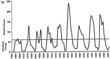 Солнечная активность. Период 1900-1997 гг., в числах Вольфа W