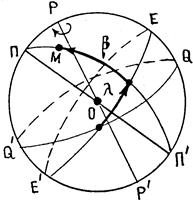 РР¢ - полюсы мира; l - эклиптическая долгота; b - эклиптическая широта; ЕЕ¢ - плоскость эклиптики; QQ¢ - небесный экватор; М - светило
