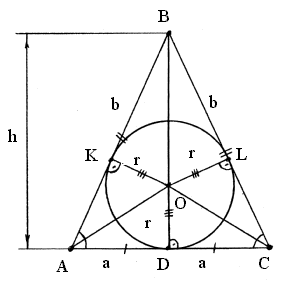 Равнобедренный ∆ АВС (рис. 1); ВD = h основная высота, опущенная из вершины В на основание АС = 2 а; АВ = ВС = b боковые стороны треугольника; DО = КО = LО = r - радиус вписанной в ∆ АВС окружности, ВАС = ВСА = .