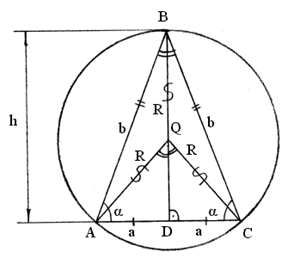 Равнобедренный ∆АВС (рис. 2); ВD = h - основная высота, опущенная из вершины В на основание АС = 2 а; АВ = ВС = b - боковые стороны треугольника; АQ = BQ = CQ = R - радиус описанной вокруг ∆АВС окружности, ВАС = ВСА = .
