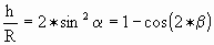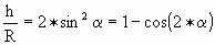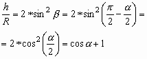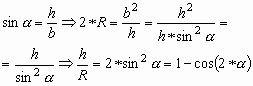 Отношение основной высоты равнобедренного треугольника к радиусу описанной вокруг него окружности равно удвоенному произведению квадрата синуса угла при основании или разнице единицы и косинуса двойного угла при основании: