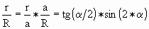 В равнобедренном треугольнике отношение радиуса вписанной к радиусу описанной окружности равно произведению тангенса половинного угла при основании и синуса двойного угла при основании: