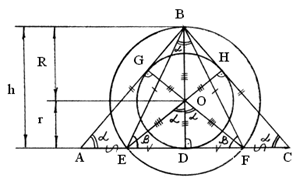 Равнобедренные ∆АВС и ∆ЕBF c общей основной высотой ВD = h. DO 1 = r и ВО 2 = R - радиусы вписанной и описанной окружностей равнобедренных ∆АВС и ∆ЕBF соответственно.
