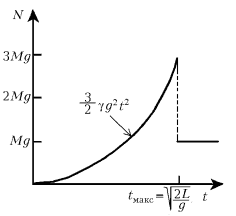и h = 0, сила давления достигает максимального значения Nмакс= 3Mg – тройной вес цепи. Но уже в следующий момент после падения и позднее, когда вся цепь свободно лежит на столе, сила давления равна просто весу цепочки: N = Mg при t > tмакс (см. рисунок).