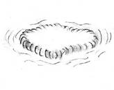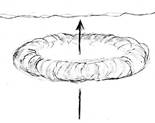 Объем воды, поступающий на поверхность в момент образования "баранок", довольно значительный и несет большой импульс - замкнутый контур такой гирлянды охватывает площадь до 10 кв. м. и явственно возвышается над средним уровнем поверхности. В связи с этим возникает вопрос: как движется снизу-вверх этот объем - в виде так называемой затопленной струи или же он изначально имеет форму тороидального вихря, некоего "калача", возникающего в глубине, который потом доходит до поверхности и распадается на связку "баранок"? Нам представляется более правдоподобным второй вариант (cм. рис. 7, 8), а механизм возникновения тороидальных кольцевых вихрей видится в форме мощных "биений" в придонном потоке воды.