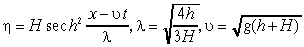 Форма стационарной волны показана на рис.1. Как видим, волна представляет собой движущийся одиночный гребень, скорость и длина которого зависят от высоты волны. Н. Забуски и М. Крускал в 1965 г. назвали его солитоном (от англ. solitary wave - уединенная волна). Главная особенность солитонов заключается в неизменности их формы в процессе распространения, и, следовательно, такие волны могут распространяться на очень большие расстояния без потери своей энергии. Роль представлений о солитонах резко возросла, когда стало ясно, что если начальное возмущение имеет другую форму, то оно сбрасывает все лишнее в хвост и трансформируется в солитоны, число которых определяется законами сохранения (массы, энергии). Кроме того, солитоны сохраняют свою форму при взаимодействии с себе подобными.