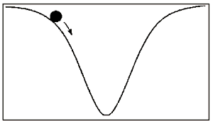 Главная наша идея состоит в учете солитонного характера нелинейной волны. В этом случае волна описывается всего двумя параметрами: амплитудой (или скоростью) и координатой (местоположением), так что солитон, по существу, очень похож на классическую движущуюся частицу. Уравнение для такой частицы хорошо известно еще со средней школы и представляет собой второй закон Ньютона: ускорение частицы, умноженное на ее массу, равно внешней силе, действующей на частицу. В таких задачах, как известно, очень удобно описывать внешние воздействия в рамках потенциальных полей, и наглядным примером здесь служит движение шарика по криволинейной поверхности (рис.2): частица колеблется в потенциальной яме.