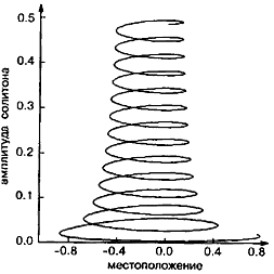 Остается понять, что происходит в нашем случае. Движущийся корабль выдавливает из-под себя воду - так образуется потенциальная яма, в которую "сваливается" солитон. Если солитон имеет ту же скорость, что и корабль, и находится непосредственно в яме, то он является стационарным и представляет собой нелинейную корабельную волну. Но это возможно только для солитона одной-единственной амплитуды. Если скорость солитона больше скорости корабля, то возможны два режима. При очень большой разнице в скоростях солитон обгонит корабль, практически не испытав взаимодействия. Когда же скорости близки, солитон сначала ускоряется, сваливаясь в яму, а затем опять тормозится, пытаясь выбраться из нее.