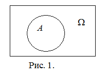 События удобно изображать в виде рисунка, который называется диаграммой Венна. На рисунке 1 пространство элементарных исходов W изображено в виде прямоугольника, а множество элементарных исходов, благоприятствующих событию A, заключено в эллипс. Сами исходы на диаграмме Венна не изображаются, а информация о соотношении между их множествами содержится в расположении границ соответствующих областей.