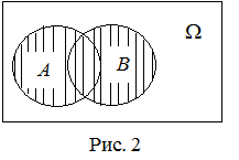 ) называется событие, состоящее из всех элементарных исходов, принадлежащих по крайней мере одному из событий А или B. Объединение событий А и В изображено на рисунке 2 в виде заштрихованной области.