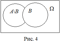 Разностью А\B или А–B событий А и B называется событие, состоящее из всех исходов события А, не благоприятствующих событию B. Диаграмма Венна разности событий А и B изображена на рисунке 4.