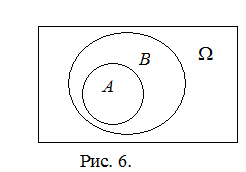 Событие В будем называть следствием события А, если все исходы события А благоприятствуют событию В. То, что из А следует В записывается символом АÌВ и изображается на диаграмме Венна так, как это показано на рисунке 6.
