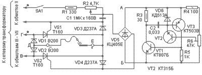 В узле управления аппаратов конденсатор С1 - МБМ или любой бумажный на номинальное напряжение 160 В и более; конденсатор С2 - КМ-6. Переменный резистор R2 - ППБ-2 с характеристикой А; подстроечный R6 - СП5-16ВА. Тумблер SA1 -МТ-1. Диоды Д237А можно заменить любыми, которые выдерживают импульсы тока в 1А. Таким же критерием определен выбор диодного моста VD5. Вместо КД513А подойдет любой маломощный кремниевый с малым обратным током. Диоды VD1 и VD2 должны иметь предельно допустимый прямой ток не менее значения сварочного тока для выбранной конструкции. То же самое относится и к выбору тринисторов VS1 и VS2. Вместо КТ807Б подойдет любой n-p-n транзистор, выдерживающий импульсный ток коллектора не менее 1 А при напряжении коллектор-эмиттер не менее 40 В, а вместо КТ502В -любой, структуры p-n-p на ток коллектора не менее 0,35 А на то же коллекторное напряжение.