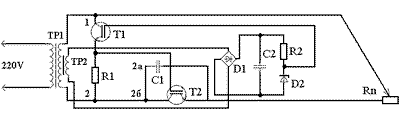 Схема ограничителя напряжения приведена на рис.12. Принцип работы следующий: пока вторичная цепь трансформатора не замкнута ток по первичной цепи идет через конденсатор С2, поэтому э.д.с. индукции, наведенное во вторичной обмотке будет равна
