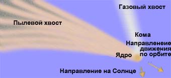 Кометы выглядят по-разному. У всех наблюдается туманная газовая оболочка-кома, которая вместе с ядром образует голову кометы. Даже если комета находится в непосредственной близости от Солнца, ее голова кажется не более чем туманным пятнышком. Самая примечательная деталь большинства комет-хвост. Наиболее ярок он, когда комета находится в окрестностях перигелия своей орбиты. Здесь особенно значителен поток тепла от Солнца, под действием которого с кометы улетучиваются в космическое пространство газы и пыль. Некоторые кометы имеют два хвоста: один-искривленный, состоящий из частиц пыли; другой-прямой, газовый, вытянутый в направлении, точно противоположном направлению на Солнце. У ряда комет было замечено по нескольку (пылевых) хвостов. Протяженность кометньк хвостов может достигать десятков и сотен миллионов километров; наблюдались кометы, хвосты которых тянулись почти на полнеба. Предполагается, что пыль, теряемая кометами, попадая в межпланетное пространство, дает начало метеорным телам, которые в дальнейшем, сталкиваясь на огромной скорости с земной атмосферой, обнаруживаются в виде метеоров. Пылинки из кометных хвостов пополняют также межпланетные пылевые облака, которые, рассеивая солнечные лучи, порождают явление, называемое зодиакальным светом.