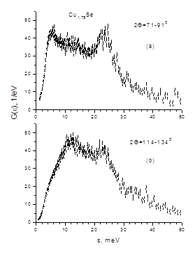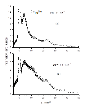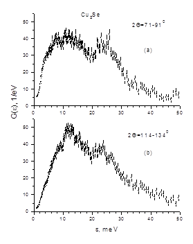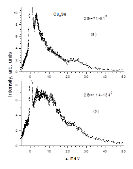 Измерения спектров неупругого рассеяния нейтронов (НРН) проводились на спектрометре по времени пролета ДИН-2ПИ на реакторе ИБР-2 [3]. Начальная энергия нейтронов E0 составляла 10.3 мэВ. Рассеянные нейтроны регистрировались одновременно двумя группами детекторов на углах рассеяния 2J1=71, 76, 81, 86, 91° и 2J2=114, 119, 124, 129, 134°. Измерения проводились при комнатной температуре. Исследовались составы Cu2Se и Cu1.75Se. Порошкообразные образцы весом около 65 г. помещались в контейнеры из алюминиевой фольги размером 3ґ70ґ110 мм3. Образцы устанавливались в геометрии «на отражение» с углом »60° к пучку падающих нейтронов.