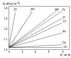 Рис. 3. Зависимость твердости от содержания легирующего элемента в твердом растворе на основе никеля.