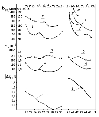 Модуль Юнга при легировании изменяется незначительно. При легировании никеля переходными металлами в количестве до 8 ат % его изменения не превышали 5 % (в случае Mn он уменьшается на 10 %). Легирование никеля переходными металлами привело к упрочнению сплавов, причем степень упрочнения при легировании элементами 4d-ряда (Zr, Nb, Mo) была выше, чем элементами 3d-ряда (Ti, V, Mn, Cr, Fe, Co).