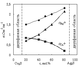 На рис. представлены зависимости общей ионной и парциальных проводимостей по ионам меди и серебра от состава при температуре 523 К. Общая ионная проводимость для твердых растворов на основе г.ц.к.-структуры в области составов от 20 мол. % до 80 мол. % Ag2S незначительно увеличивается с ростом содержания серебра. Парциальные проводимости значительно изменяются во всем интервале исследованных составов. Для состава AgCuS получено отношение парциальных проводимостей