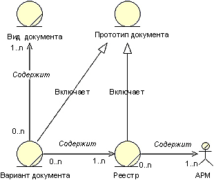 Класс Реестр состоит в связи ассоциации с определенным множеством классов Вариант документа. Конкретный класс вида Вариант документа может находиться в связи с несколькими классами вида Реестр. Одновременно Реестр может содержать документы, относящиеся к различным классам Вид документа.