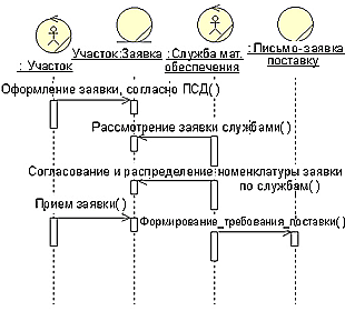 Реализация бизнес-процессов конкретного прецедента описывается диаграммами последовательности. Например, процесс подачи письма-заявки поставщику, принадлежащий прецеденту “Работа с заявкой на материалы и оборудование” характеризуется следующей диаграммой последовательности: