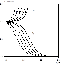 Рис. 3. Зависимость концентрации на аноде (а) и катоде (б) от поляризации при L=0,1 м, T=25°C, и с0=0,1 моль/л и ddx10-4, равных, м: 1 – 16; 2 – 8,3; 3 – 4,4; 4 – 2; 5 – 1.
