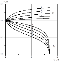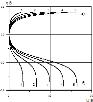 Рис. 5. Зависимость анодной (а) и катодной (б) поляризации от напряжения при L=0,1 м, dd=10-4 м, T=25°C, и с0, равных, моль/л: 1 - 0,01; 2 - 0,02; 3 - 0,03; 4 - 0,04; 5 - 0,05.
