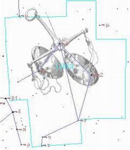 В небольшом созвездии Весов обратите внимание на две достопримечательности. Первая из них - звезда альфа, вторая по блеску после бета звезда этого созвездия. Уже в бинокль отлично видно, что главная горячая голубая звезда 2,8m на большом расстоянии (5 минут дуги) имеет желтоватый спутник 5,3 зв. величины. Обе звезды обладают сходными собственными движениями, но огромное расстояние между компонентами заставляет все же сомневаться в физической связи этих звезд.