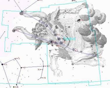Созвездие Тельца содержит еще одну исключительную в своем роде достопримечательность — знаменитую Крабовидную туманность. Она находится рядом с яркой звездой дзета, но для наблюдения это объект трудный. Только в темные прозрачные ночи можно рассмотреть здесь в телескоп или сильный бинокль маленькое овальное светящееся пятнышко, размером всего 6' Х 4'.
