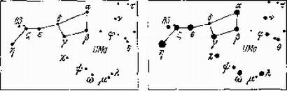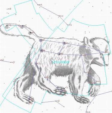 На современных звездных картах созвездие Большой Медведицы занимает гораздо большее место, чем то семизвездие в форме ковша, с которым обычно связывается это название. Невооруженный глаз различает в Большой Медведице 125 звезд, то есть свыше ста солнц, среди которых наше Солнце выглядело бы самой заурядной звездочкой. Чтобы увидеть в этой россыпи звезд фигуру Медведицы с длинным изогнутым хвостом (кстати сказать, не встречающимся у земных медведей), надо обладать богатым воображением. Зато семь главных, самых ярких звезд созвездия образуют ковш, настолько отчетливо выделяющийся на черном фоне ночного неба, что с этого небесного ковша обычно и начинают изучение созвездий.