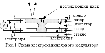 В таком виде электрокапиллярный эффект используется и в наши дни. Например, на его основе работает электрокапиллярный модулятор [1], устройство, изменяющее количество отраженного света под действием напряжения (Рис.1). Устройство состоит из двух связанных отсеков, в которых находится капля ртути. Прикладывая напряжение, можно "перегонять" каплю из одного отсека в другой, изменяя тем самым диаметр ртутного зеркальца в верхнем отсеке и, следовательно, количество отраженного света. Предполагается, что такое устройство найдет себе применение в оптоэлектронике.