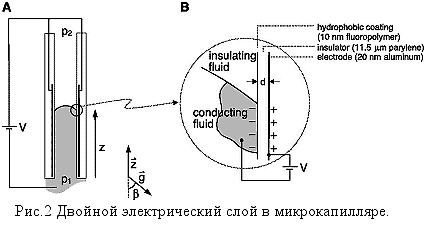 Совсем недавно была разработана и другая схема использования электрокапиллярности. В работе [2] описана схема установки, в которой микротечения жидкости возникают из-за двойного электрического слоя на границе жидкость-твердое тело (а не жидкость-жидкость). Принципиальная схема установки показана на Рис.2. В стенках капилляра, в котором находится электролит, вмонтированы электроды. Когда между электродами и проводящей жидкостью создается разность потенциалов, на электродах и на стенках капилляра возникает поверхностный заряд. Заряды притягиваются друг к другу, что приводит к усилению взаимодействия жидкости со стенками, то есть к эффективному усилению смачиваемости. Как следствие, изменяется высота столбика жидкости в капилляре.