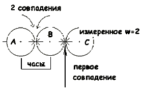 А теперь отметим главную особенность нашей модели. Если мы строим относительность вращений по аналогии с относительностью для поступательного движения, то мы должны предположить, что две системы вращения, A и B, которые сравнивались первоначально, должны приписать друг другу равные скорости вращения. Но у нас этого вроде бы нет: мы говорим только о совпадении меток, которое позволяет системе B зафиксировать свой полный оборот. Если мыслить по аналогии, B должна тогда приписать системе A также только один оборот, но мы начали с того, что заявили: эта система A может "на самом деле" совершить и большее число, главное – чтобы метки совпали. Кроме того, читатель, наверное, уже обратил внимание, что измеряемой системе я сразу приписал скорость в 2[с/м], но, если мыслить по аналогии, мы должны были бы рассмотреть системы A, B и C, так, чтобы вращения A и C относительно центральной системы отсчета B были единичны и равны между собой.