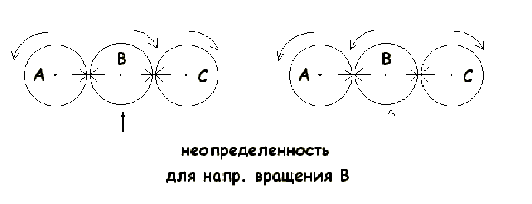 Относительно вращающейся системы B вращательные скорости систем A и C будут единичны, но противоположно направлены: ведь синхронность совпадений меток не свидетельствует о направленности вращения! Возникает проблема: пусть у A и C скорости противоположно направлены, но в какую же сторону тогда крутится "колесо" B? Вопрос чрезвычайно интересный. Получается, что "колесу" можно приписать вращение в любую сторону! Это делает нашу модель полностью аналогичной классической схеме относительности поступательного движения. В классической схеме системе отсчета приписывался покой – нуль поступательной скорости. Нулевая скорость само по себе, безотносительно к чему либо. Аналогом этого "абсолютного самого по себе покоя" в нашей модели оказывается неопределенность направления вращения. Именно неопределенность, ведь определенность наступает только тогда, когда вводится четвертая система вращения D, теперь для выполнения правила арифметического сложения скоростей вращения система B будет иметь направление вращения в ту же сторону, что и C и D. Легко убедиться, что эта неопределенность будет возникать всякий раз, когда мы переходим в новую систему отсчета.