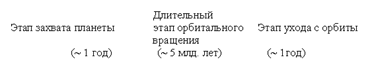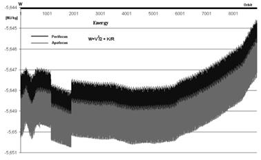 Не меньшие трудности теоретического характера возникают и при объяснении изменения параметров орбит планет и их спутников в Солнечной системе или “рыскания” по высоте и “тангажу” искусственных спутников Земли и Марса, обнаруженные при изучении параметров их орбит. Если составить схематический график теоретически рассчитанной высоты для орбиты планеты Земля с момента ее захвата Солнцем и до ухода ее с орбиты и реальные орбиты искусственного спутника (ИС) Марса MGS в процессе многих оборотов, то картина окажется удивительно совпадающей в качественном виде. На рис. 2. показано изменение полной энергии американского спутника в перифокусе и в апофокусе на протяжении почти 9000 оборотов вокруг Марса, а на рис. 3 изображена высота орбиты Земли, при ее захвате и длительном вращении ее вокруг Солнца.
