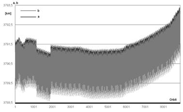 Имеющиеся данные о: высоте орбиты в перифокусе, апофокусе и среднем радиусе Марса, позволяют определить усредненные значения большой и малой полуосей эллипса, а также эксцентриситет орбиты MGS. При этом необходимо отметить, что истинная орбита вообще не представляет собой какую-то правильную геометрическую фигуру. График, представленный на рис. 5, однозначно показывает увеличение обеих полуосей орбиты. Получается, что спутник движется, как бы, по раскручивающейся спирали.