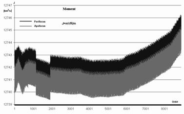 На рис.6 представлен график изменения момента импульса MGS, отнесенный к его массе, для перифокуса и апофокуса. Как видим, момент импульса спутника очень увеличился за время его нахождения на орбите. Для кеплеровских орбит значения этого параметра в апофокусе и перифокусе должны быть равны между собой, что вытекает из закона сохранения импульса. Однако на самом деле, моменты импульса в перифокусе и апофокусе не равны между собой. Темная полоса на рисунке соответствует их разнице в динамике длительного движения MGS.