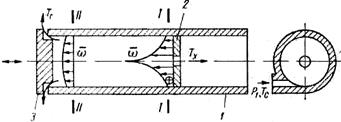 Вихревая труба представляет собой устройство, в котором процесс дросселирования сопровождается частичным преобразованием энергии газа в механическую работу, в результате чего часть газа охлаждается, а другая часть — нагревается. Рассмотрим схему вихревой трубы, представленную на рис. 1. Сжатый газ поступает в цилиндрическую трубу / через отверстие, расположенное по касательной к ее внутренней окружности. Труба с одной стороны ограничена диафрагмой 2 с небольшим отверстием в центре, с другой стороны — вентилем 3. Благодаря тангенциальному расположению отверстия, струе газа, охладившегося при расширении, сообщается вихревое движение. Поле угловых скоростей w вихря в сечении /—/, проходящем через плоскость входного отверстия, является неравномерным — наибольшими угловыми скоростями обладают слои, расположенные ближе к геометрической оси трубы; по мере удаления от центра угловая скорость вихря падает.