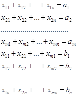 неизвестными. Её особенность состоит в том, что коэффициенты при неизвестных всюду равны единице. Кроме того, все уравнения системы (2.1) могут быть разделены на две группы: первая группа из т первых уравнений (“горизонтальные” уравнения) и вторая группа из п остальных уравнений (“вертикальные” уравнения). В каждом из горизонтальных уравнений содержатся неизвестные с одним и тем же первым индексом (они образуют одну строку матрицы перевозок), в каждом из вертикальных уравнений содержатся неизвестные с одним и тем же вторым индексом (они образуют один столбец матрицы перевозок). Таким образом, каждая неизвестная встречается в системе (2.1) дважды: в одном и только одном горизонтальном и в одном и только одном вертикальном уравнениях.