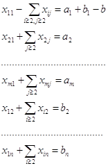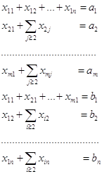 Такая структура системы (2.1) позволяет легко установить ее ранг. Действительно, покажем, что совокупность неизвестных, образующих первую строку и первый столбец матрицы перевозок, можно принять в качестве базиса. При таком выборе базиса, по крайней мере, один из двух их индексов равен единице, а, следовательно, свободные неизвестные определяются условием
