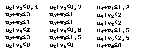 Будем улучшать этот план методом потенциалов: ui- потенциал Аi ,vj- потенциал Bj. Тогда u1+v2=2,u2+v1=0,4, u3+v1=0,7, u3+v2=1, u3+v4=0,8, u4+v3=2, u4+v4=1,5, u4+v5=2,5 ,u4+v6=0.Положим u1=0,тогда v2=2,u3=-1,v1=1,7,v4=1,8, u2=-1,3,u4=-0,3, v3=2,3,v5=2,8,v6=0,3.Составим таблицу: