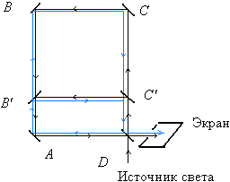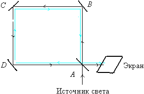Луч света попадает на полупрозрачное зеркало A, где расщепляется на два луча. Один луч движется по контуру ABCD, другой – в противоположном направлении.