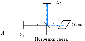 Предположим, далее, что Саньяк несколько изменил схему своего опыта так, как это изображено на рис.2. Как и прежде, луч света, проходя через полупрозрачное зеркало, расщепляется на два луча, движущихся во взаимно противоположных направлениях к непрозрачным зеркалам S1 и S2 , отражаются от этих зеркал и, снова проходя через полупрозрачное зеркало, попадают на экран или в зрительную трубу, где наблюдается интерференционная картина. Прибор вращается относительно оси, проходящей через точку A.