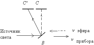 Как следует из правильного анализа теории этого опыта, луч света, движущийся от полупрозрачного зеркала к зеркалу С перпендикулярно направлению движения прибора, отклоняется в направлении, обратном предполагаемому движению прибора, т.е. в направлении движения «эфирного ветра», обусловленного движением прибора, как это изображено на рис.4.
