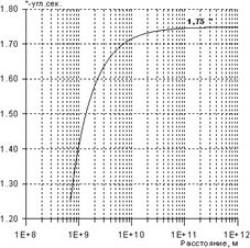 Рис. 1. Зависимость угла отклонения луча света Солнцем от расстояния до источника вдоль трассы, проходящей рядом с Солнцем