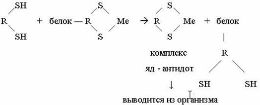 2. Для нейтрализации тиоловых ядов применяются дитиоловые антидоты (доноры SH- групп). Механизм их действия представлен на схеме.