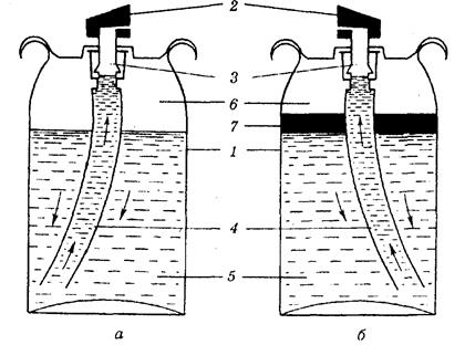 2 — розпилювач; 3 — клапан; 4 — сифонна трубка; 5 — розчин лікарської речовини; 6 — пари пропіленту; 7 — пропілент